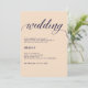 De här bröllopsinbjudningarna i snyggten har en rosa. Ord "bröllop" står överst i den moderna marinblåa kalligrafin. All information från bröllop visas i en enkel modern text. En elegant, trendiget letar efter bröllop.