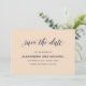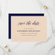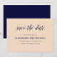 Dessa enkla och minimala inbjudningar i bröllop spara datum har marin blå kalligrafi på rosa.