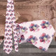 Hals i bröllop, med en liten mönster av en vattenfärgad blomma i rosa och blå mot en rosa.