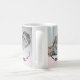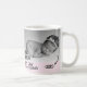 Cute och underbart fars dag-kaffe mugg med två anpassade fotografier av din dotter, en verklig färg på ena sidan och en nyfödd svart och vit på den andra sidan (svartvit effekt appliceras automatiskt). Under bilder läser anpassadet i mörk grått typsnitt Lycklig fars dag från ert största fläkt, med barnets namn, innevarande år och hennes födelseår i ljus rosa bakgrund.
