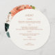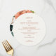 Den här cirkelformade menykortsmallen innehåller en uppsättning contemporary typsnitt i hörn, mot en chic elfenbensbakgrund. På baksidan av kortet finns en färgstark visning för blommigt, bredvid ett par namn och händelsemedatum.