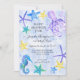 Octopus Seahorse Starfish Beach Blue Baby Shower-inbjudan skapades från akryliska vattenfärgsverk som målats av en internationellt licensierad konstnär och produktdesignern Audrey Jeanne Roberts. Roligt, vita och färgstarka havslevande varelser i lila, lavender, blått, akvblått, grönt och gult dansar runt inbjudningstexten. På motsatt sida finns ett fält där du kan anpassa budskapet om en överraskningsdusch, information om daghemskorgen eller som visas med "Bokar för Baby". Copyright.