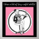 Blond med långa ben och högklackar sitta som är ordförande i redot att ta diktationen. "Jag har mycket användbara kunskaper!" Färg är rosa och svart