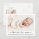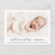 Officiellt Våra | Minimal Fotomeddelande om adoption med modern typografi och ett stort horisontellt foto på framsidan. Baksidan har en extra fototopp med en stor rubrik för fullständigt namn och personligt meddelande från familjen. Baksidan är också ett postkort som kan skickas. Klicka på redigeringsknappen för att anpassa denna design med dina foton och detaljer.