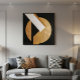 En abstrakt som sammanfogar en gyllene cirkel, mörk triangel och vit rand i elegant kontrast. Bilden skapar balans mellan styrka och subtilitet genom att utforska dialogen mellan geometriska former, ljus och skugga, vilket framkallar modernitet och tidlös sofistikering.