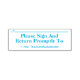 Den här enkla utformningen av gummi frimärke innehåller meddelandet "Skriv under och gå tillbaka omedelbart till", förutom en rad som namnteckning eller initialer kan skrivas över. Den har också en skräddarsydd lärares namn. Den kan användas av en lärare, lärare eller lärare för att be en förälder eller en eller flera väktare i student att granska och bekräfta klass som ett student fick på en essä, en examen, ett frågeformulär, ett projekt eller någon annan skoltjänst.