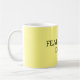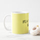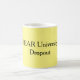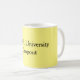 Klassiker 11 uns, kaffemugg med humoristiskt motivational citationstecken: "FRUKTA universitetenutgången" på gul bakgrund.