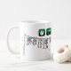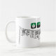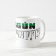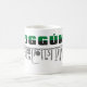 Oggun mugg med akaba. Namn av Oggun i text med cowrie-design. Tryckt i tre färger. grönt, svart och grått.