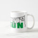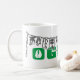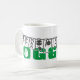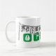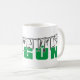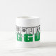 Oggun mugg med akaba. Namn av Oggun i text med cowrie-design. grönt och grått i färger tryckt.
