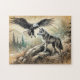 Öagle och en varg i ett naturområde i vilden, illustrerad med mjuka kol- och pastelltoner, som fångar storheten och skönheten hos vilda djur i sin naturliga livsmiljö