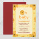 På framsidan visas en söt babyduschinbjudan i gult- och marontypografi och en "oh baby"-text överst med en blomma inuti. Den här designen är söt och passar perfekt för din babydusch.