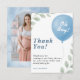 This photo eucalyptus baby shower thank you card is ideal for parents-to-be seeking a blend of natural beauty, contemporary design, and a personal touch to express their appreciation. The soothing greenery offers a calming backdrop, while the pops of blue balloons add a festive and celebratory touch, making your chosen photo truly shine. This design is perfect for themes ranging from modern botanical to rustic charm, ensuring your thank-you notes perfectly complete your stationery suite.