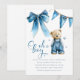 Set the scene for a joyful celebration with these blue jean baby themed baby shower invitations. Featuring an adorable bear in denim dungarees, a sweet denim bow, and playful blue stars scattered across a modern invitation template, they're perfect for honoring the parents to be.