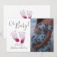 FotoOh Flicka Baby Shower-inbjudan. Skicka dessa enkla och snyggt pars barnduschinbjudningar till familj och vänner. De är dekorerade med modern typografi och söta baby fötter i rosans skuggor. Lägg till ditt eget foto, namn och information.