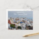 Postkort från Santorini, Grekland, som visar staden Oia. Den fotografiska bilden fångar stadshuset på öns sida med havet bakom. Santorini är en av de mest populära grekiska öarna och att ha besökt den är inte svårt att förstå varför. Det finns två idylliska städer, huvudstaden Fira, med den berömd kyrkan med tre klockor, även om jag noterade att många kyrkor på Santorini har tre klockor och staden Oia där människor samlas för att dagligen se den spektakulära solnedgången. De har båda massor av vitt tvättat byggnad och smala gator samt blåa kupoler. Santorini är en mycket populär grekisk ö för par som vill gifta sig i sol. Men om man vill ha en strand så måste man kom bort från Fira och Oia, hur söt de än är, så har de inga stränder. Santorini, Greklands vykort