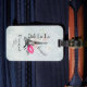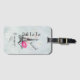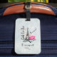 Personlig bagagetagg med grått vintage mönster bakgrund med svag rosa ros. Överst är en illustration av de skrivna sidovägarna "Effel torn och Oj La La". Ett intryck av shock rosa läppstift lämnade bredvid berömdens landmärke med texten xoxo! Bonjour skrev i ett parisiskt stil-teckensnitt som kan anpassas/ändras till kostym efter dina behov.