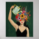 Den här konsten har en målning av en kvinna vars huvud är täckt av blommor som vattnar blommorna från hennes sinne mot en djup texturerad bakgrund.