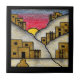 Njut av denna sydvästra öken keramiska plattan med en bild av en adobe by folkkonst pjäs av Indiamoss. Med jordiga färger och en färgrik solnedgång, gör detta stycke en rolig present eller ett tillägg till din sydvästra heminredning.