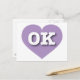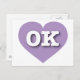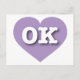 Detta vykort har ett mjukt, lavendelhjärta som innehåller det feta, vita övre fodral brev OK, förkortningen officiell för Oklahoma, det tidigare tillståndet. Baksidan av vykortet är tom i väntan på dina handskrivna känslor eller personlig. Välj teckensnitt stil, storlek och färg.