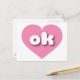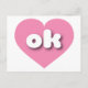Det här vykortet har en lugn, coola rosa hjärta som innehåller det feta, rundade, vita nedre fodral brev ok, en lekfull version av förkortningen för Oklahoma, det tidigare tillståndet. Baksidan av vykortet är tom och väntar på din anpassade text eller dina handskrivna känslor.