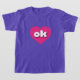 Denna t-shirt har ett pulserande shock rosa-hjärta som innehåller det feta, vita, rundade nedre brev ok, en lekfull förkortning för Oklahoma, ju tidigare tillstånd.
