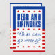 Öl och fyrverkerier - Vad kan gå fel rolig inbjudan till en 4 juli-fest. En rolig inbjudan till en självständighetsdagfest med alkohol och fyrverkerier! Röda, vita och blå färger.