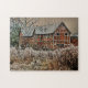 En konstnärlig design av ett vackert gammalt Tudor-byggnad som med ett tomt hus på framsidan och som sitter på en gård på baksidan, på ett mycket kall, frost och täckt av snö.