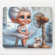 A whimsical scene features a charming, cartoon-style elderly woman with big eyes and a playful smile sitting in front of a vintage fan, which blows her lace dress