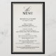 This old money inspired black and ivory wedding menu card features refined serif typography with an elegant script heading, framed by a bold black border for a timeless and distinguished presentation. The structured layout highlights each course in classic black tie style, creating a sophisticated and heirloom-inspired aesthetic.