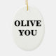 Något att säga "älskar jag dig!", med denna förtjusande oliv dig julprydnad. Beklädadesignen presenterar en jätte, texturerad grön oliv med en röd hjärtformade pimento. Motsatssidan presenterar ord, "oliv dig.", Min godhet! Ska clevernessen avslutar aldrig?