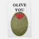 Något att säga "älskar jag dig!", med denna förtjusande oliv dig kökshandduk. Designen presenterar en jätte, texturerad grön oliv med en röd hjärtformade pimento. Ovanför det är ord, "oliv dig.", Min godhet! Ska clevernessen avslutar aldrig?