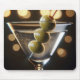 Ett klart martinistiskt glas innehåller en cocktail som är försedd med tre grönt oliver på en skevare mot en bakgrund av den varma bokeh ljus