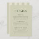 Elegant modern och tidlös, detta randiga bröllopsdetaljkort sätter den perfekta tonen för din stora dag. Med mjuka pastelliknande vertikala ränder och en raffinerad blandning av klassisk serif och flytande skript typografi, sammanför denna design enkelhet och sofistikation, vilket skapar en ren, graciös estetik som är idealisk för moderna, romantiska eller trädgårdstematiska bröllop.