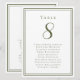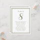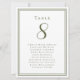 Vår trendiga 16,5 x 22 cm bröllopsbord nummer gästlista har en mall för bordnumret och lista över gäster vid bordet. Personifiera elegant bokstavsstil och skrivstil med era gästers namn och detaljer i rustik olivgrön på en krispig vit bakgrund. Perfekt tillägg för ett bröllop, årsdag eller stor förlovningsfest. Baksidan är en dubblett av framsidan som möjliggör enkel visning från båda sidor. Anpassad färgförfrågan accepteras.