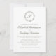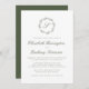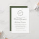 Denna eleganta bröllopsinbjudan design har en olivgrön skript monogram initial omgiven av en linjekonst botanisk krans på en vit bakgrund. Namnen visas i olivgrön skript, med resten av texten i klassisk serif-teckensnitt. Baksidan av kortet är enfärgat olivgrönt.