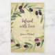 Denna flasketikett för olivolja som bröllopsfavoriter har en ram av akvarell olivkvistar med gröna blad och svarta oliver. Meddelandet "Infused with Love" och namnen är skrivna i en handskriven stil; resten är skriven i versaler. Ovanför namnen finns ett litet guldhjärta. Bakgrunden är pergamentpapper.