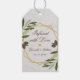 Denna olivolja-gåva till bröllopsgäster har en geometrisk oregelbunden guldram med olivgrenar med gröna blad och svarta oliver upp och ner över två gyllene hexagoner som överlappar varandra. Bakgrunden är vit marmor. Meddelandet "Infused with love" och namnen är skrivna med en elegant kalligrafisk stil; resten är skrivet med versaler. Det finns ett (falskt) guldhjärta ovanför namnen.