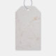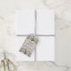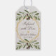 Denna olivolja-gåva till bröllopsgäster har en geometrisk oregelbunden guldram med olivgrenar med gröna blad och svarta oliver upp och ner över två gyllene hexagoner som överlappar varandra. Bakgrunden är vit marmor. Meddelandet "Infused with love" och namnen är skrivna med en elegant kalligrafisk stil; resten är skrivet med versaler. Det finns ett (falskt) guldhjärta ovanför namnen.