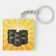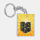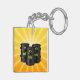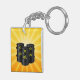 Tre svarta fat olja mot gultens bakgrund. Den här designen ser ut att vara effektiv i den här nyckelkedjan