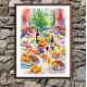 Perfect for kitchen wall art, dining room decor, restaurant decor, wine lover gifts, housewarming presents, and summer home styling. The rich colors and painterly texture make this artwork ideal for canvas prints, posters, invitations, kitchen accessories, and home decor products. A stunning choice for anyone who loves food art, still life paintings, Mediterranean decor, or vibrant entertaining scenes.