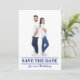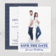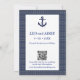 Här är en rolig design för paret som njuter av segling eller båtliv. Under fotot, på framsidan, står "Spara datum" "för vår bröllop". På baksidan finns en blå kant med gyllene vågor. Överst på designen finns ett blått ankare som du kan ta bort eller byta ut. Denna design visas med en QR-kod (som du kan skapa) som kan länkas och skannas till en webbplats för information om bröllopet.
