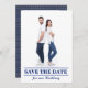 Här är en rolig design för paret som njuter av segling eller båtliv. Under fotot, på framsidan, står "Spara datum" "för vår bröllop". På baksidan finns en blå kant med gyllene vågor. Överst på designen finns ett blått ankare som du kan ta bort eller byta ut. Denna design visas med en QR-kod (som du kan skapa) som kan länkas och skannas till en webbplats för information om bröllopet.