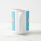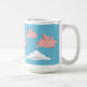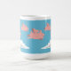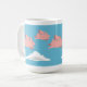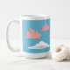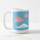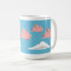 En mugg som visar grisar som flyger över vit, fördunklar mot en blå himmel.
