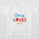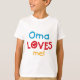 Oma Kärlek Me T-tröjor, kort, klistermärken, kokocksväskor och annat med färgstark röd färg, gult och blå text och hjärtdesign. De här Oma Kärlek-kläderna och presentplaggen får Oma att le!