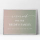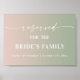 Ombre bladgrön och rosafärgad skylt reserverad för brudens familj - i vacker handskriven stil och din personliga text. En stilren men enkel design med en mjuk, tonande ombre-färgskala i bakgrunden. Klicka bara på länken "redigera med designverktyg" under området för textanpassning till höger och välj din anpassade bakgrundsfärg. Denna mall för skyltar gör det snabbt och enkelt att skapa fantastiska tillägg till din bruddekoration. Skyltar kan förstoras, det finns många storlekar att välja mellan, samt alternativ för anpassad inramning och passepartout.