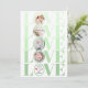 Valentines day-fotokort för Ombre mint grönt KÄRLEK. Texten "KÄRLEK"-typografi i fem ton mint grönt, fyra bilder och texten "Lycklig Heart's Day" med ett hjärta i stället för ord. Baksidan har en mönster av ombre mint grönt diagonal rand. En del av fotot är foto av fotografi © Storytree Studios, Stanford, CA