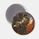 Johannes Vermeer Glass of Vin magnet. Oljemålning på canvas circa 1660. Ett av Vermeers vackraste scener av nederländskt liv i mitten-klass från 1700-talet. Glaset vin fångar ett par som dricker genom ett öppet fönster. En ung kvinna i en mörk rosa klänning och vit huvudduk sitter vid ett bord och sitter på ett genomskinligt glas av vin som ung man med långt mörk hår i frock och svart hatt medan hon håller en vit porslinkaraffe. En underbar gåva till fläkt av Johannes Vermeer, nederländsk målning, barockisk konst.