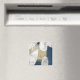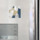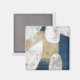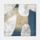 En stor abstrakt i marint blått täcker arbetsytan kant till kant med skärningar som visar en texturerad vit bakgrund. Ett slitet, texturerat beige område sitter över den blå formen medan vitt linjer vrider som rep i ett dynamiskt avsluta till biet.