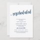 Detta är ett bröllopskort för uppskjuten vigsel, med kortets titel, Omschemalat, i marinblå scriptfont, med modern rustik design.
