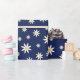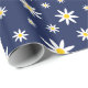 En mönster av vita blommor i daisyn med gult mitten på marinblått.